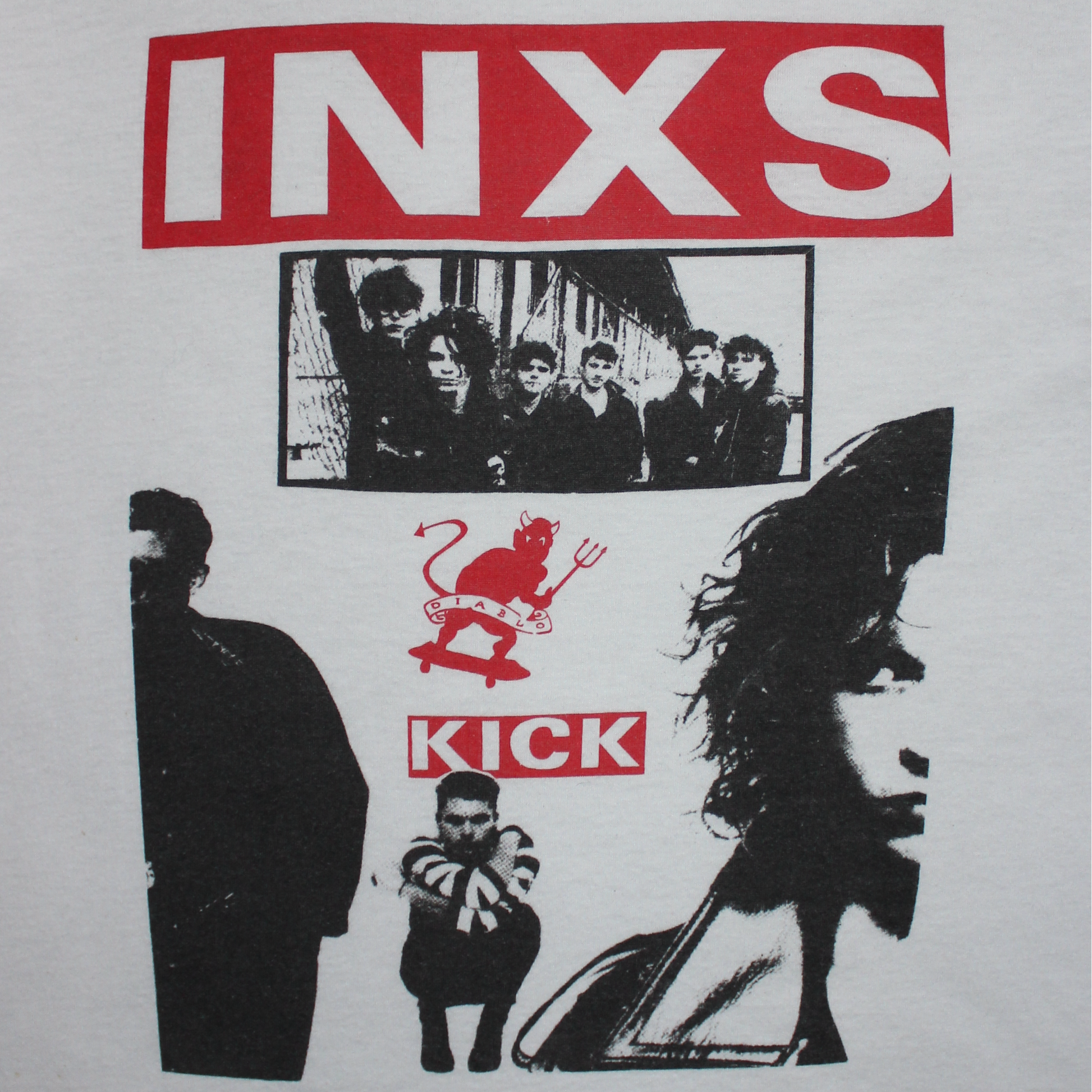 1987 INXS Kick T-Shirt. Features the Kick album artwork on the front with the large INXS spellout above it.