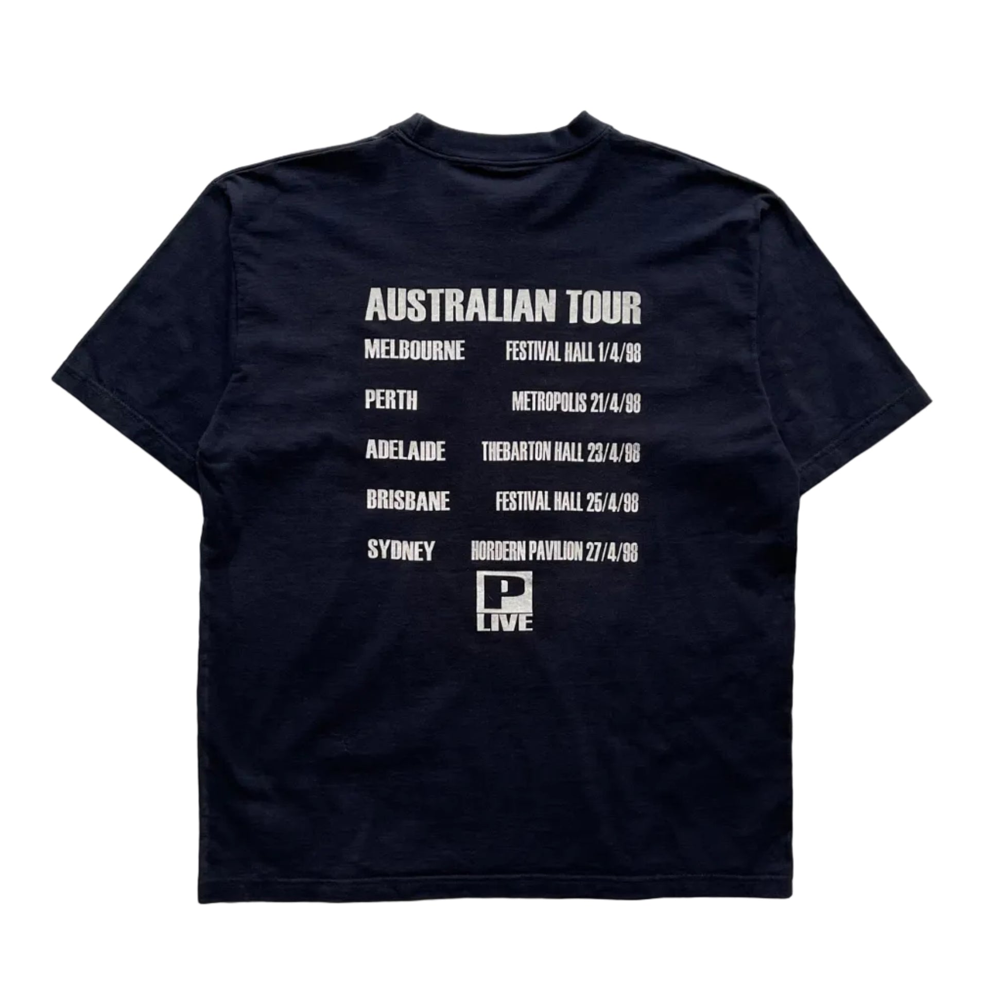 1998 Portishead T-shirt featuring a bold “PORTISHEAD P LIVE” graphic printed on the front. The back lists the 1998 Australian Tour dates including Melbourne, Perth, Adelaide, Brisbane, and Sydney with venue details.