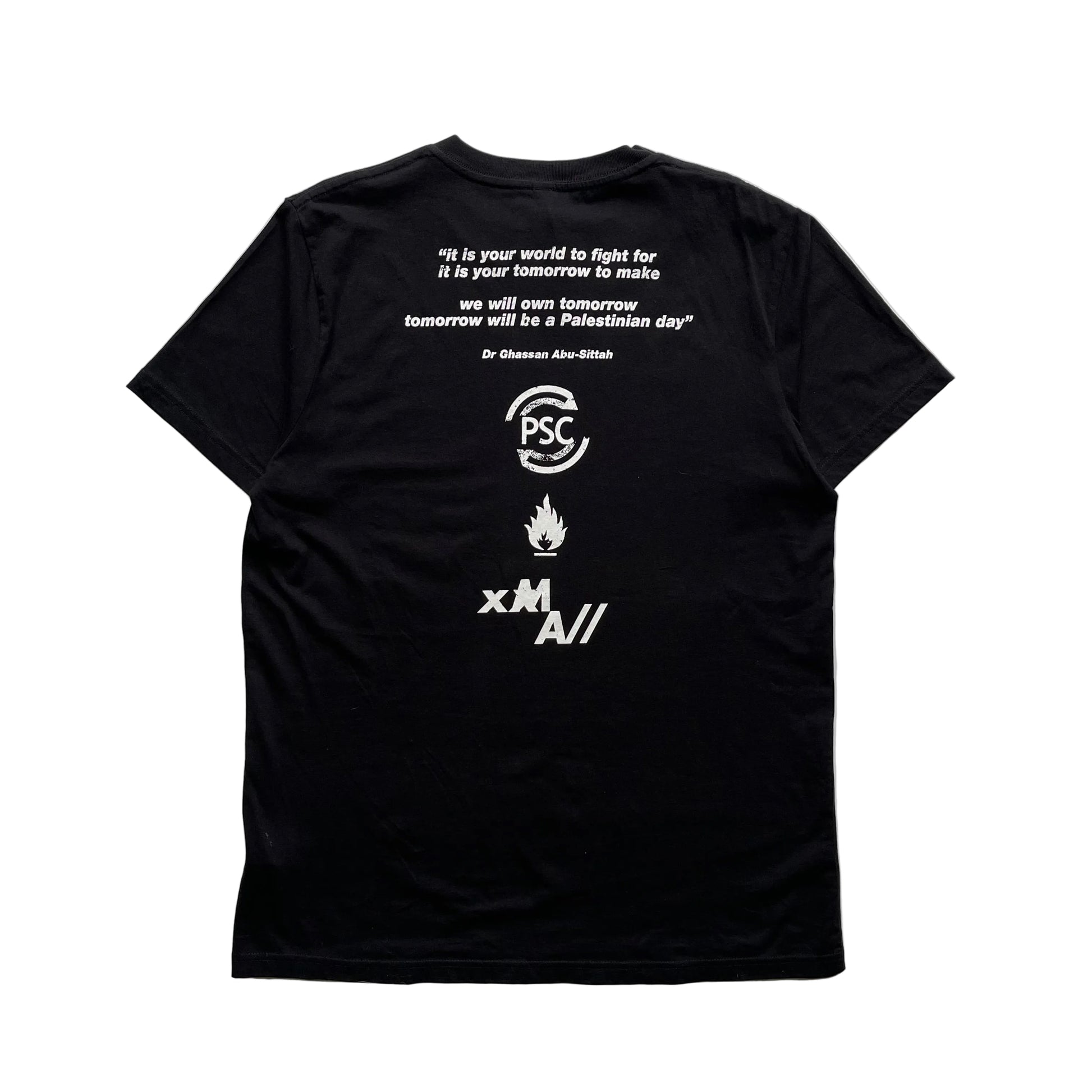 Black graphic T-shirt released in 2025 in collaboration with Massive Attack and the Palestinian Solidarity Campaign (PSC). Back print also features the PSC logo and Massive Attack branding, tying the piece to the band’s ongoing activism and support campaigns.