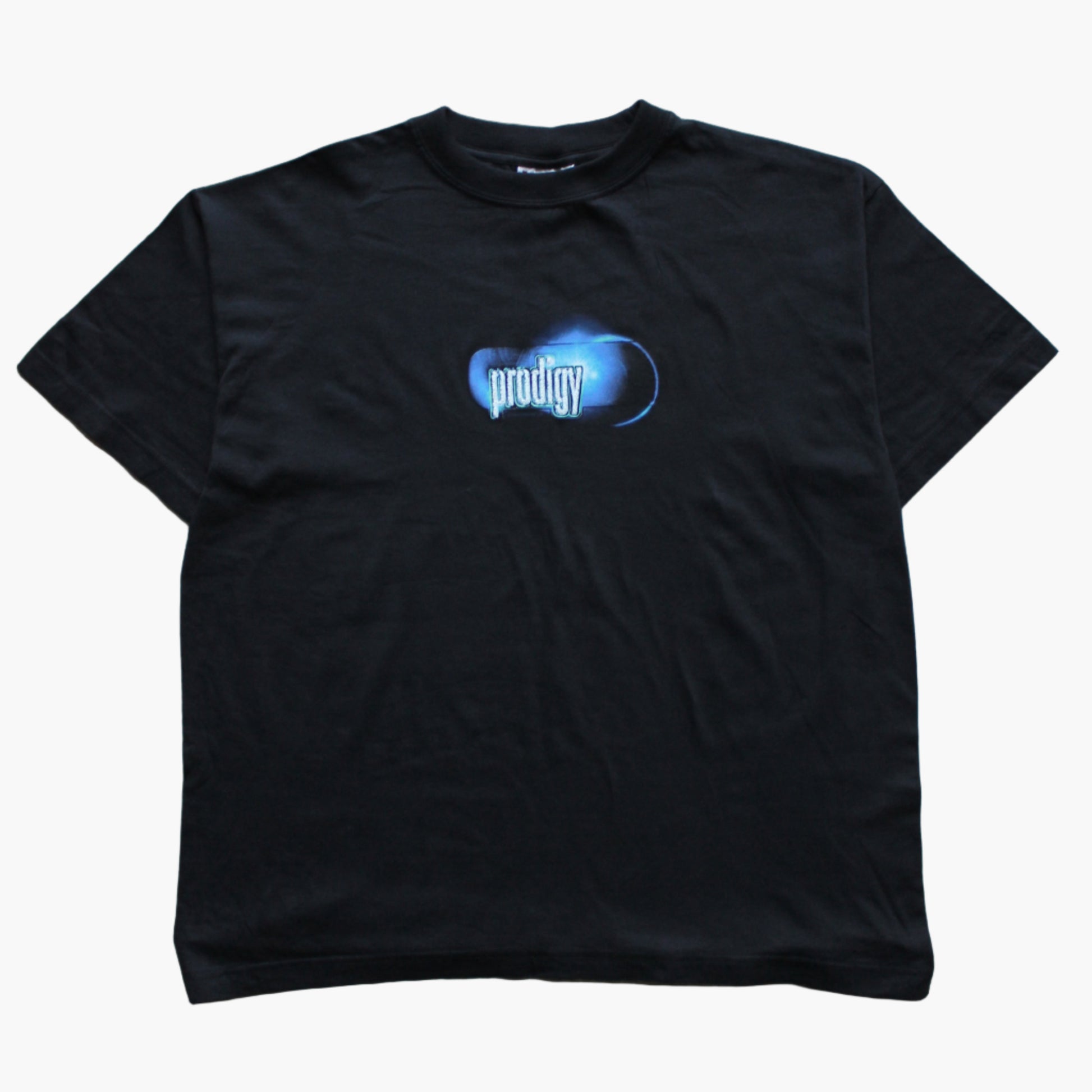 Late 90s Unreleased prototype The Prodigy Pill graphic tee from the Fat of the Land Era. Front graphic of the Prodigy spellout aswell as an illuminous blue pill graphic